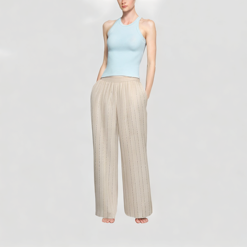Sequin Stripe Embellishment: The sequin stripe elements are cleverly integrated into the trousers, shining with the light, showing a high-end texture in a low-key manner. It not only adds a three-dimensional sense of layering, but also breaks the monotony of solid-color trousers, easily creating a fashionable focus. Loose Wide-Leg Cut: The overall wide-leg casual version is designed, naturally draping from…