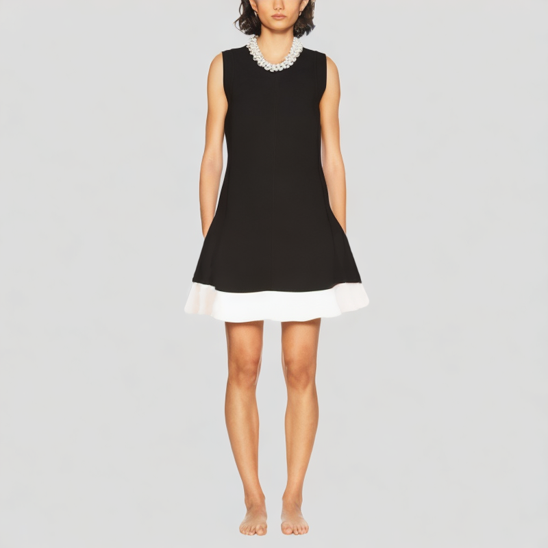 Round neck design: The skirt adopts a classic round neck cut, and the edge of the neckline is exquisitely embellished with shiny pearls, which surround the neck like a necklace, injecting softness and gorgeousness into the whole dress. The details show quality, highlighting the gentle and elegant temperament of women. Black and white splicing color matching: The overall black and…